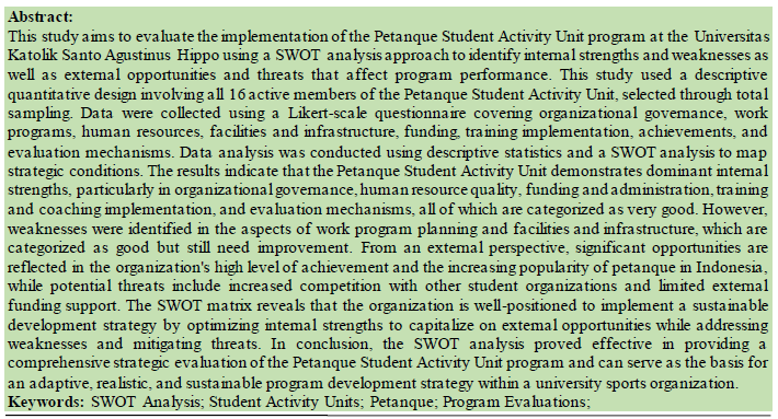 Journal of Physical Education and Health Science publishes high-quality scientific articles from original research, reviews, case studies, and theoretical analyses within the fields of physical education, sports science, and health sciences. Journal of Physical Education and Health Science is published three times a year, in April, August, and December. Each issue contains articles based on research, systematic reviews, or scientific studies relevant to the scope of the journal, and has undergone a rigorous peer review process to ensure the quality and scientific integrity of the publication.